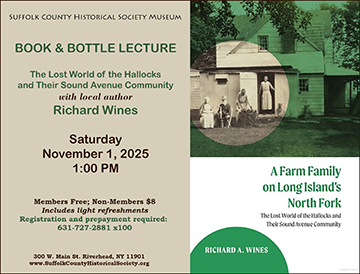 ABOUT THE AUTHOR: Richard Wines was educated at Yale, Harvard, and Brown, where he earned a Ph.D. in history. Since retiring from a career as a Wall Street investor relations consultant in 2000, he has devoted his time to historic preservation and land preservation projects in Riverhead. He is a current member of the Hallockville Museum Farm board of directors and its past president. He is chair of the Riverhead Landmarks Preservation Commission. He is also co-chair of the Riverhead Farmland Preservation Committee, and he has worked on the Riverhead Comprehensive Plan and on the creation of three new parks in Riverhead.